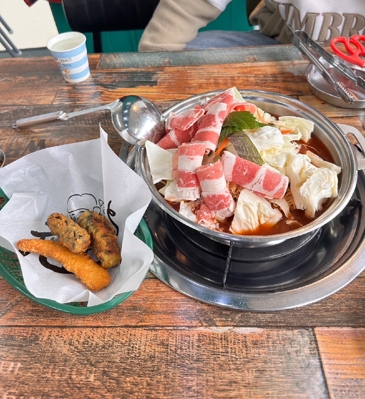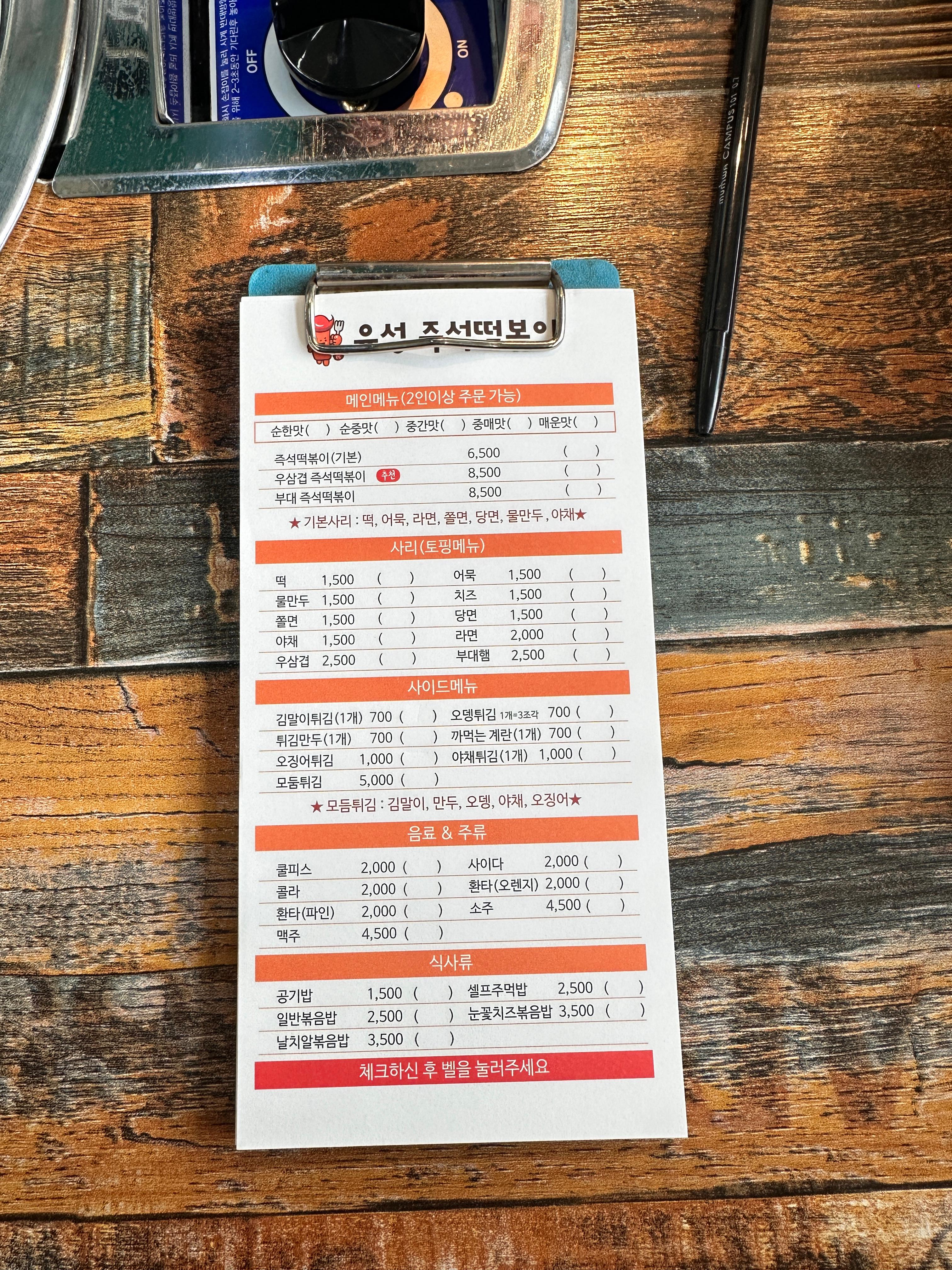 저희는 우삼겹 즉석떡볶이 2인, 오징어 튀김 1개, 김말이 2개 주문했어요